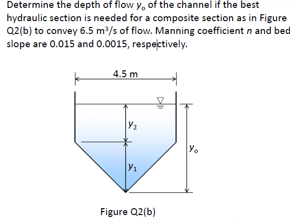 Determine the depth of the flow of channel if the best hydraulic channel is needd for composite channel in figure to convey flow rate of 6.5(m^3/s) , Manning coefficient n on bed slope are 0.015 and 0.0015 respectively .