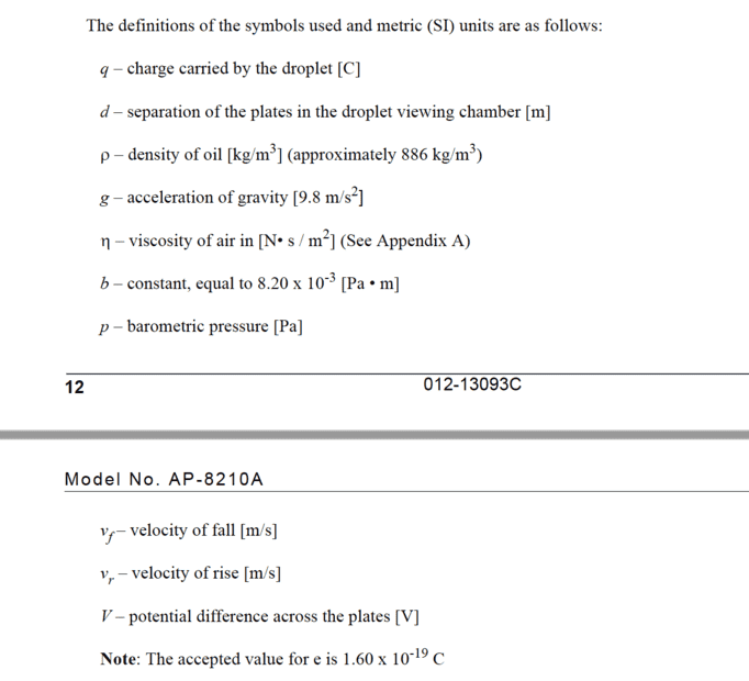 The manual defines a simple method to calculate for the charge of the electron, which accounts for the effective viscosity of air. Page 12 and 13 of the linked lab manual defines all constants and list the method as described above.