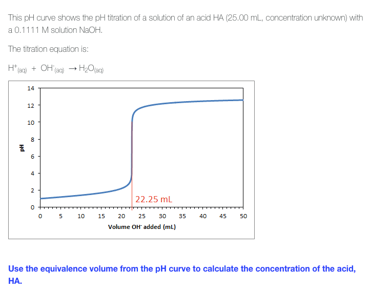 Use the equivalence volume from the pH curve to calculate the concentration of the acid, HA.