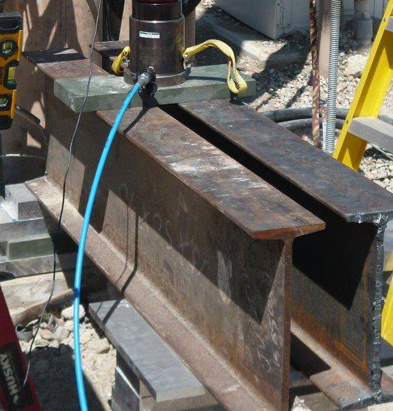 Using a pair of I-Beams running parallel to each other with a single load being applied from directly above. The load sits on a steel plate across both Beams that are 4" apart. The Beams are pinned at each end with the single load centered half way (i.e. 12' beams with load applied at 6').