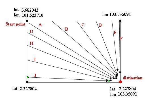 this code use to calculate all distances from A to J points on the map ( has longitude and latitude ), the starting point coordinates ( Lat and Long ) is 3.682043 and 101.523710 and the destination is 2.227804 103.35091