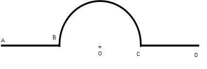 A line (A-B-C-D) with uniform charge density is shown in the following figure. Calculate the electric field and the potential at center O, where AB=CD=Diameter of the semi-circle.