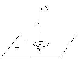 A large flat nonconducting surface carries a uniform surface charge density of sigma. A small circular hole of radius R has been cut out from this surface as in the figure. Ignore the fringing of the fierld lines around all the edges and calculate the electric field at point P located a distance z from the centre of the hole. (Hint says to refer to the electric field due to a charged disc and use superposition)