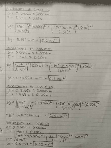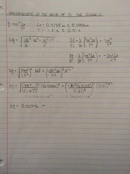 The discussion revolves around calculating the propagated error in the acceleration due to gravity (g) based on measurements taken from a pendulum's period (T) over multiple cycles. The original poster expresses concern about the size of the calculated error and its implications for significant figures.