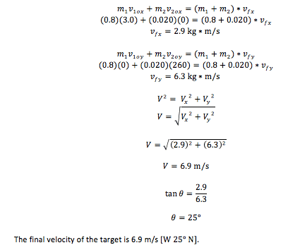 a) A 0.800 kg target slides along the ice at 3.0 m/s W when it's hit by a 20g arrow moving at 260 m/s N. Find the final velocity of the target after the inelastic collision.
