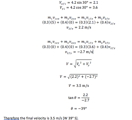 b) A 0.3 kg puck A moving at 5 m/s W undergoes a collision with a 0.4 kg puck B which is initially at rest. Puck A moves off at 4.2 m/s [W 30 N]. Find the final velocity of puck B.