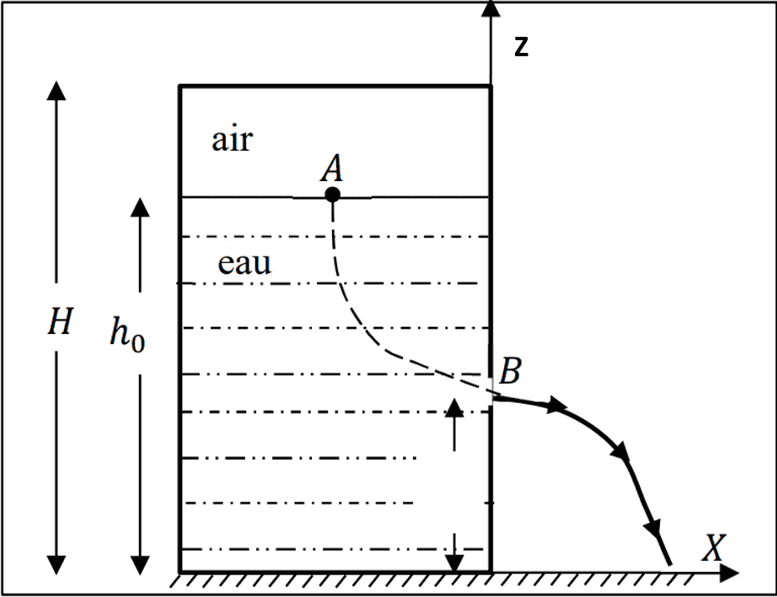 Here is my problem: "We have a closed tank of large size which contains a liquid topped by air at a pressure equal to the atmospheric pressure. If the tank is closed, as the water flows out, the volume of air above the free surface increases, so the pressure decreases (law of perfect gases). We seek to find the pressure variation (𝛥P) at the surface of the water in the tank as a function of the z axis (whose origin is at B) and to give the expression of v (the flow velocity) as a function of z."