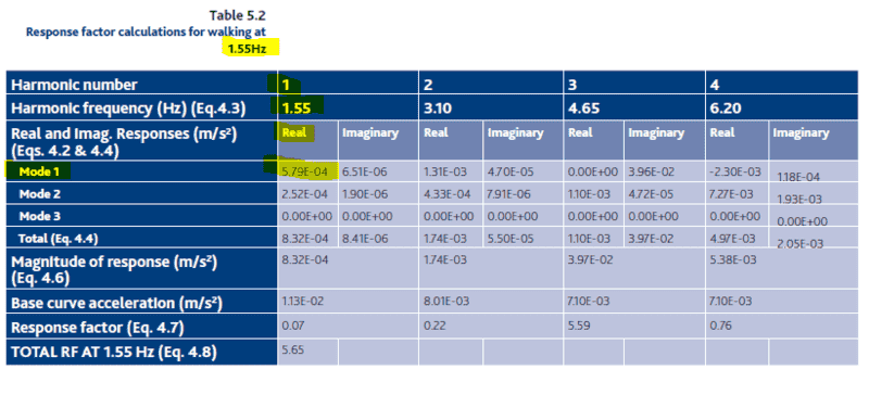 The discussion focuses on troubleshooting footfall induced vibration calculations, specifically comparing results from a user's calculations to those presented in the "Design Guide for Footfall Analysis" on page 44. The user reports a calculated value of 0.000726, while the guide indicates a value of 5.79E-04. Key issues identified include a misunderstanding of the calculation for the parameter ##\mu## and a potential misapplication of the damping ratio ##\zeta_m##, which should be set at 1.5% instead of 0.9%. These factors contribute to the discrepancies in the results.