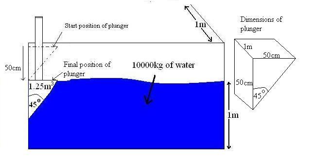 My problems here are that I am displacing water using a vertical plunger moving downward at 25cm/sec also as seen in the picture the plunger is at 45degrees.