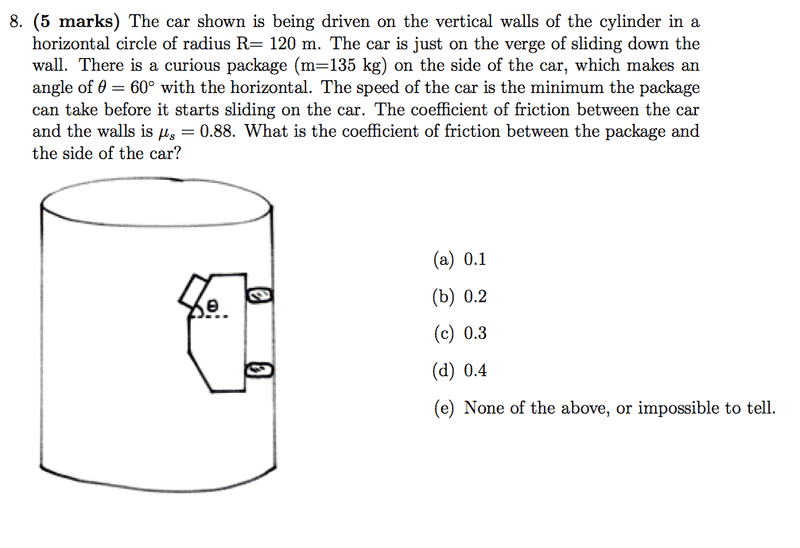 Then I drew a FBD for the package, and found that in the vertical direction, mu*Nsin60+Nsin30 = mg = 1323. So, therefore mu has to be c (0.3).