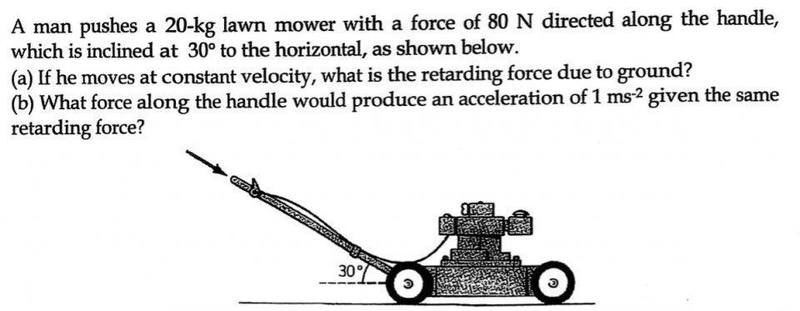 There are indications of confusion regarding the application of trigonometric functions and the identification of all forces acting on the mower, including the weight and any opposing forces. Participants are encouraged to clarify these aspects as they progress in the discussion.