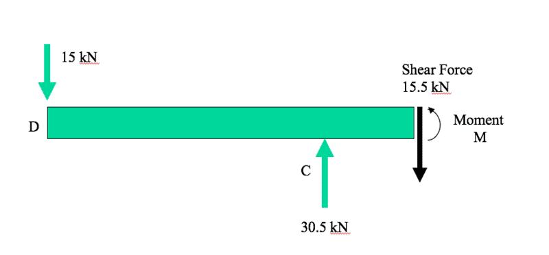 This might be overdoing it however, since we are only asked about the forces and moments on the vertical cut line through the beam in a distance 1 m to the right from the point C.