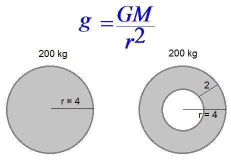 Consider the 2 objects in the pic. They both have the same mass of 200 kg. They both have a radius of 4 meters. However, the object on the right is hollow, with the walls being 2 meters thick. For the gravity equation, and the object on the right, does one use a radius of 4 squared, or the wall thickness of 2 squared?