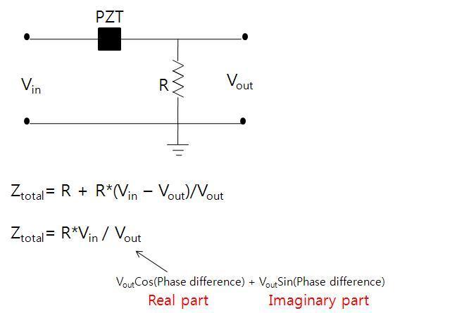 I figured out that the impedance can be calculated using the formula that I've drawn by inputting the measured values of Vin, Vout and R, no complex numbers here(Ztotal = R*Vin/Vout), but I have no idea how to work out Real part and Imaginary part.
