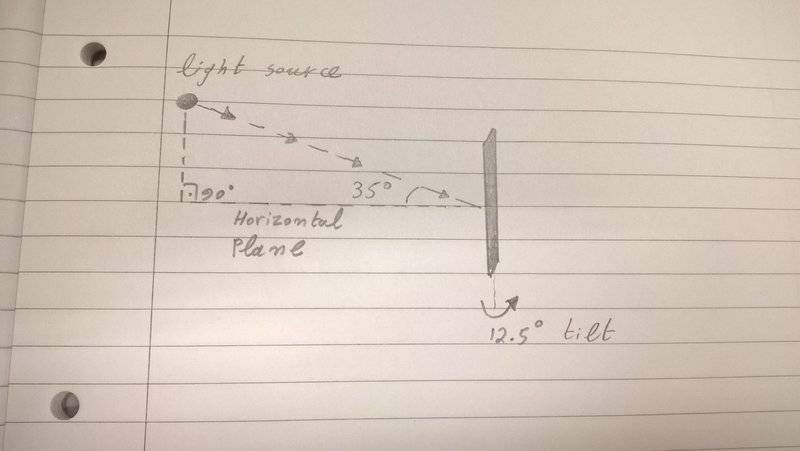 The problem involves calculating the incidence angle of light rays on a tilted plate. The light source is positioned at an elevation of 35 degrees above the horizon, while the plate is tilted 12.5 degrees around its vertical axis, affecting the angle of incidence.