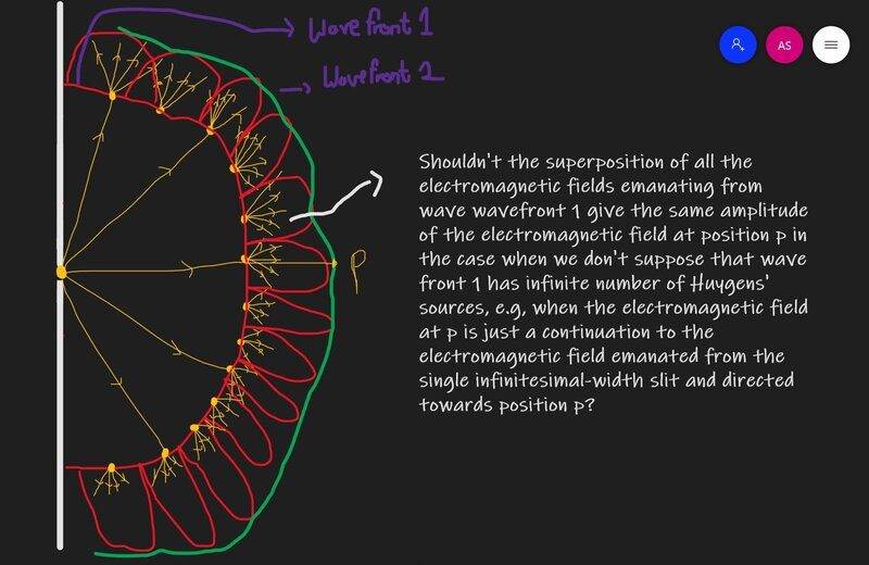 I think in all textbooks, they don't take the electromagnetic field emanating from the other wave fronts ( the wave front that is not present at the slit) into account in summing up the electromagnetic radiation to get the intensity at a certain position. Shouldn't we take them into consideration to calculate the intensity? or is there a proof that the superposition of all the electromagnetic fields emanating from wave wave front 1 creates electromagnetic field at position p (on wave front 2 just after wave front 1) with an amplitude just equal to the amplitude of the electromagnetic field there but in the case when we don't suppose that wave front 1 has infinite number of Huygens'