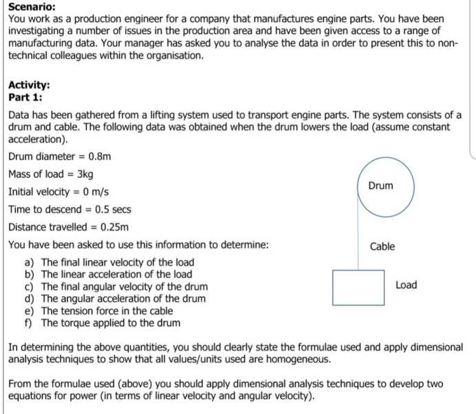 One of the maths problems I have been given involves a drum and cable. It states the diameter(0.8m), mass (3kg), initial velocity (0m/s), time to descend (0.5secs) and distance traveled (0.25m)
