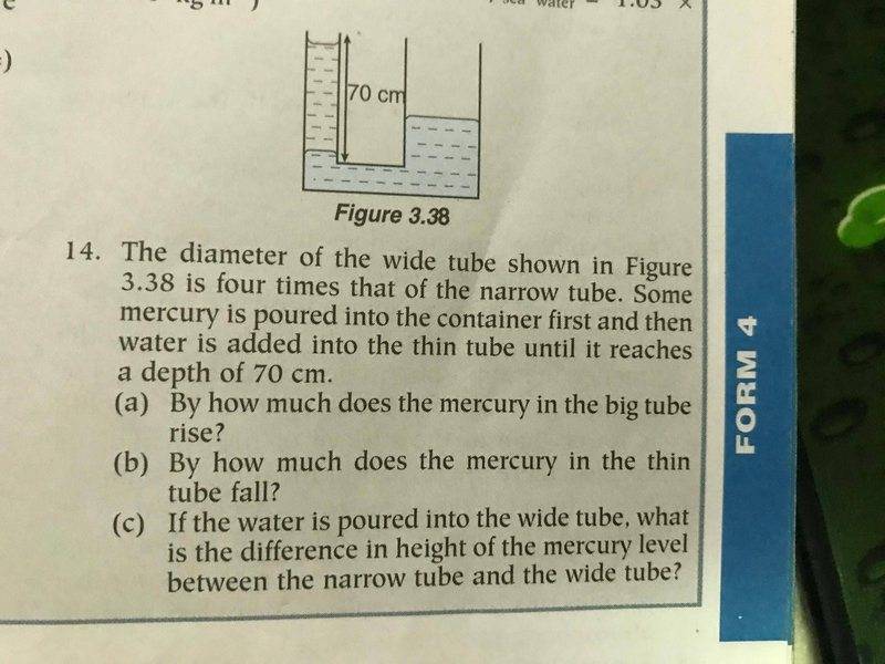 h2 = 0.32cmb) By refer to the a) calculation, the level dropped from mercury in narrower tube = 5.14cm