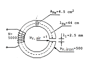The attached picture shows a spool coil on a iron core with an air gap measuring 2.5mm. The spool is coiled by 0.5mm2 with rho cu = 0.0175 Ωmm2 /m. The average winding diameter for the spool is 3.18cm.