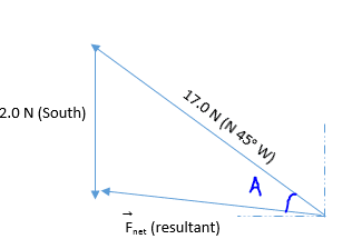 The discussion revolves around calculating net force using vector addition, specifically focusing on the addition of forces in different directions and the application of trigonometric principles to find angles in a triangle formed by these vectors.