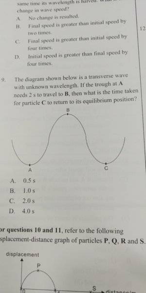 The discussion centers on calculating the period of a transverse wave, specifically determining whether the correct answer is A (0.5s) or B (1.0s). The consensus among participants indicates that the journey from point A to B represents half of the wave's period, leading to the conclusion that the full period is 4 seconds. Therefore, the time for point C to return is calculated as 1.0s, confirming that the answer is indeed B. The initial answer provided was identified as incorrect.