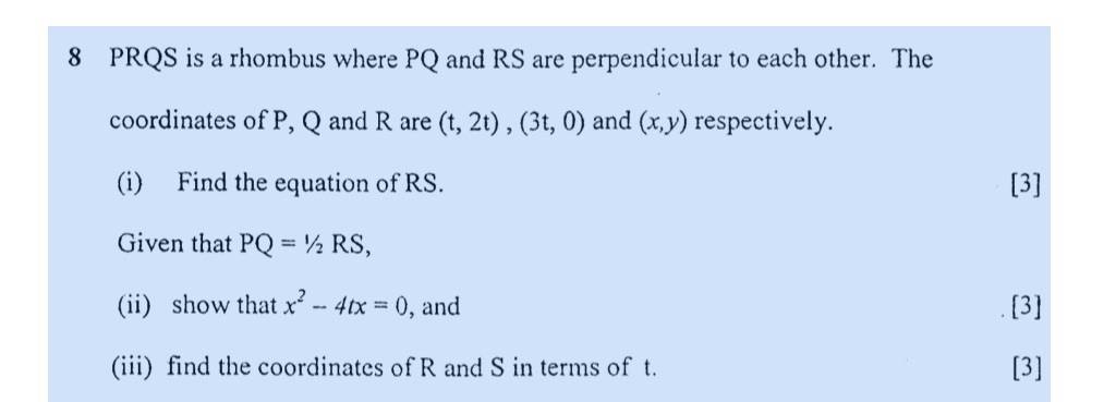The discussion revolves around calculating the coordinates of points R and S using parametric equations of lines in the context of proving properties of a rhombus. Participants are exploring various approaches to derive these coordinates and are addressing different parts of the proof sequentially.