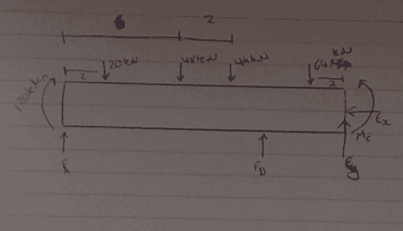 - A participant notes that the beam is resting against a wall at point E and cannot develop a moment there, only an axial force.