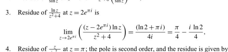 - Calculate the residue of the complex function ## f(z) = \dfrac{\ln z}{z^2 + 4} ## at ## z = 2 e^{i \pi} ##