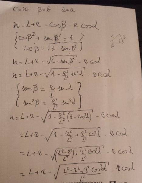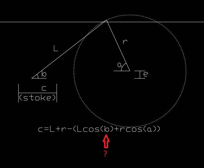 - One participant expresses confusion about calculating the rotation angle of the connecting rod while knowing the stroke, particularly regarding the elimination of angle 'b' from the formula.