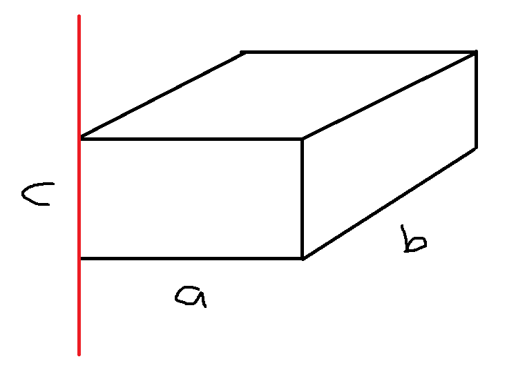 There is a rectangular prism of uniform mass distribution with lengths of a, b, and c (b>a>c). Calculate it's rotational inertia about an axis through one corner and perpendicular to the large faces.