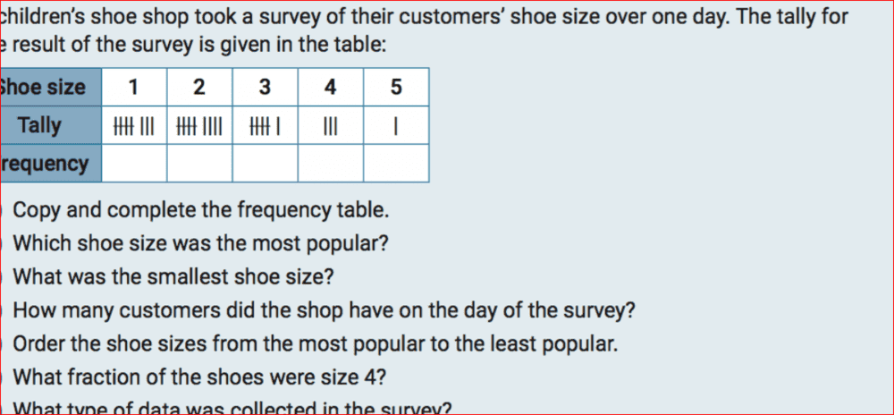 - Participants are questioning how to calculate the fraction of size 4 shoes based on the provided frequencies. There is confusion regarding the total number of shoes sold and how to correctly interpret the frequency data.