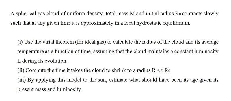 The discussion centers on calculating a star's radius and temperature using the virial theorem and luminosity. Participants emphasize the importance of internal kinetic energy and gravitational potential energy in establishing a relationship between a star's radius (R) and core temperature (T). The conversation highlights the need to keep luminosity (L) constant while evaluating how internal temperature and radius change over time. Key calculations involve determining the total energy in the star and relating it to the rate of energy loss via luminosity. Ultimately, the goal is to understand the timescale for stellar evolution and how the Sun and Earth have different evolutionary timelines.