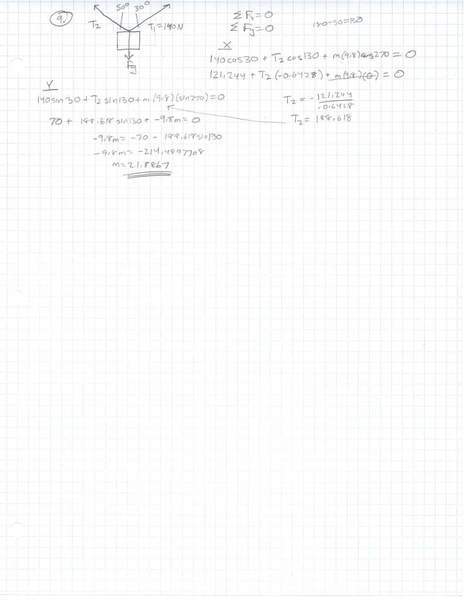 Basically I just tried to isolate T2 from the X forces equation, and then substitute that into the Y forces equation. The questions asks for the tension in the other cable and the mass of the light.
