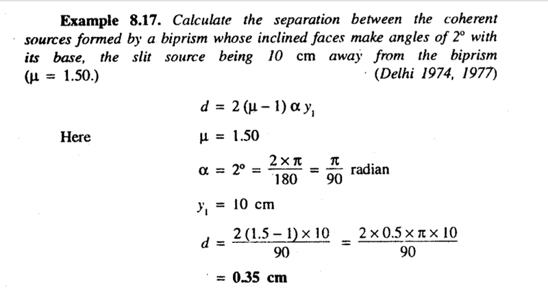 The calculation of the distance between the virtual sources of Fresnel's biprism utilizes the small angle approximation, where the angle α is expressed in radians. The formula for separation is defined as d = 2(μ – 1) sin(α) y₁, which simplifies to d = 2(μ – 1) α y₁ when α is small. This approximation holds true because the values of sin(α) and α in radians are nearly equivalent for small angles. A correction was noted in the calculations, emphasizing the need to use π in the formula instead of degrees.