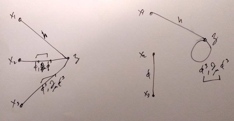 [tex]\begin{aligned}{\left\langle {0} \right\rvert} &T( h(x_1) \phi^3(x_2) \phi^3(x_3) e^{-i \int d^4 z H_{\text{int}}(z) }) {\left\lvert {0} \right\rangle} \\ &={\left\langle {0} \right\rvert} T( h(x) \phi^3(y) \phi^3(w) ( 1 - i \int d^4 z h(z) \left( { \partial_0 \phi^3(z) \partial_0 \phi^3 z + \partial_k \phi^3(z) \partial_k \phi^3(z) } \right) ){\left\lvert {0} \right\rangle},\end{aligned}[/tex]