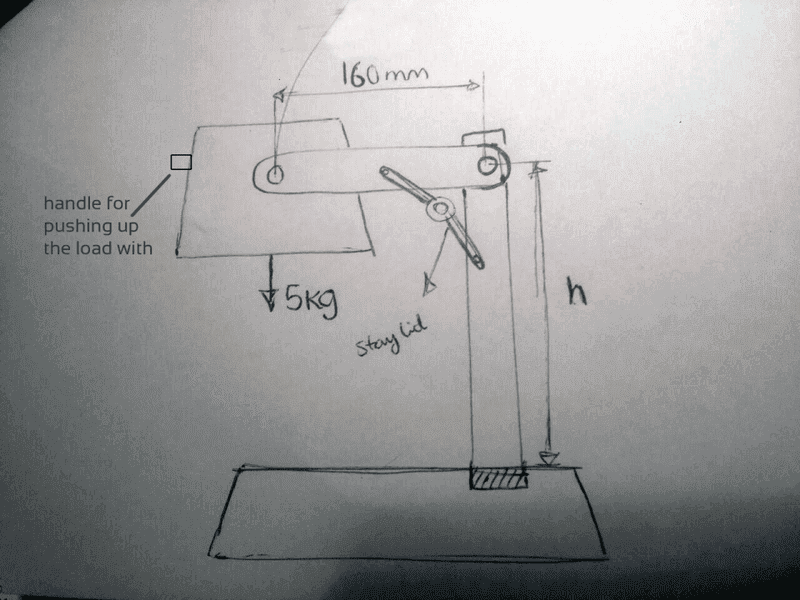 I have a system with a lever arm that's attached to a vertical support at its pivot point. The lever is pushed up by hand and is supported by a stay lid like in the image. I need to calculate the area and thickness of the arm and the column but the only numbers I have is the load attached to the end of the arm, the length of the arm and the height of the column. In all the examples I found on the web either the tensile strength or the stiffness of the beam is given. And I don't have any of these numbers yet. So, could you please help me figure out how to find the followings: