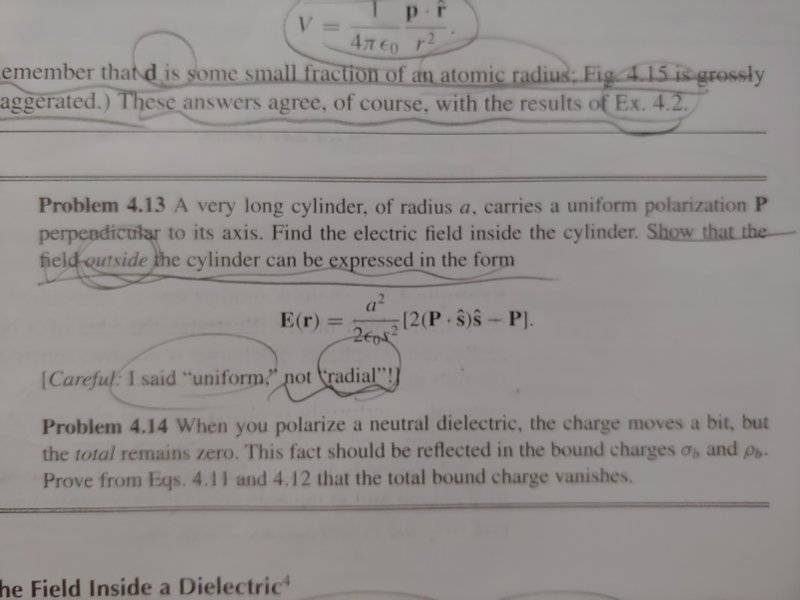 In the textbook (Introduction to Electrodynamics by Griffiths), the problem in the attached image asks to find the electric field ##E## outside a dielectric. The problem consists of dividing the electric field into the one produced by the negative charges in the dielectric and another by the positive charges and adding them up.