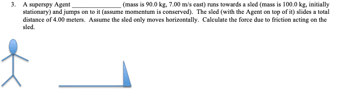 A man (mass is 90.0 kg, 7.00 m/s east) runs towards a sled (mass is 100.0 kg, initially stationary) and jumps on to it (assume momentum is conserved). The sled (with the Agent on top of it) slides a total distance of 4.00 meters. Assume the sled only moves horizontally. Calculate the force due to friction acting on the sled.