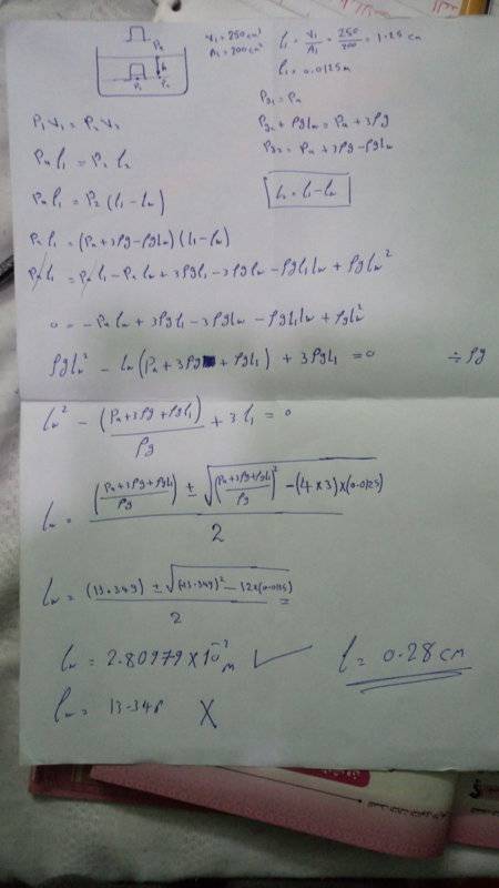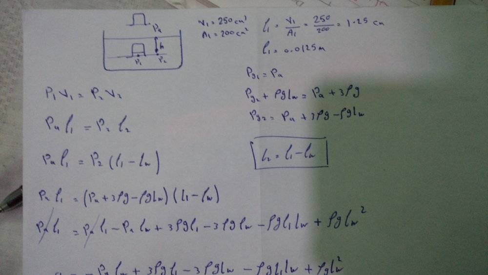 Pg = Pa + ρgh (so his solution becomes significanly easier ) , he didn't take into his account the pressure due to the rising water as i did :