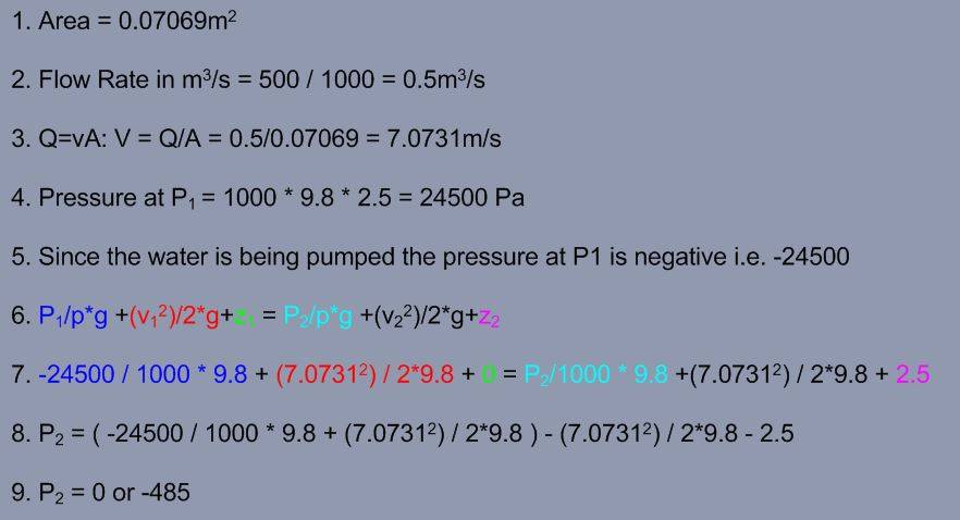 I have tried to use the formula Q = vA and Bernoullis principle to calculate the pressure at P2 by doing the following:-
