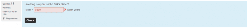 Since on a previous question I found the mass of Gak's planet to be M = 2.12*10^24 (and got it right). Subbing it in & all relevant variables;