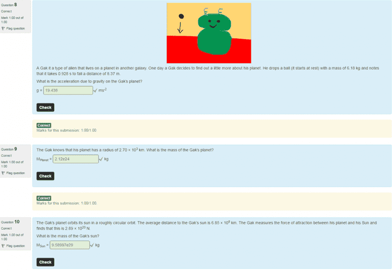Question: A Gak it a type of alien that lives on a planet in another galaxy. One day a Gak decides to find out a little more about his planet. He drops a ball (it starts at rest) with a mass of 6.18 kg and notes that it takes 0.928 s to fall a distance of 8.37 m.