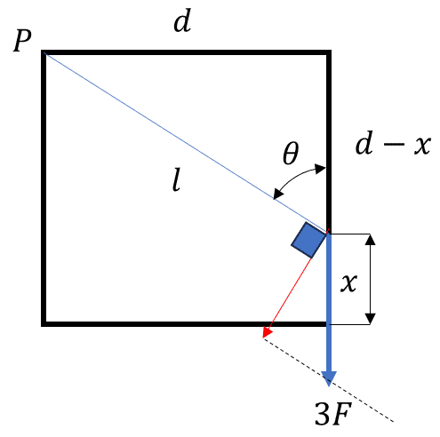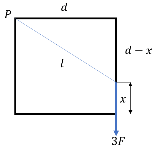 So I started by just figuring out what forces are going to have torque. I know the one heading straight down from the pivot won’t have any and the one going at an angle from the pivot won’t be included in the net torque since it’s at the pivot. The rest of the forces have torque and they are both clockwise (going the same direction). I can get the torque for the F on the bottom left (it’s just Fd), but I can’t figure out how to find the torque for the 3F since it’s starting point isn’t as the corner. How would I find that? And how would I represent it in my formula to find net torque?
