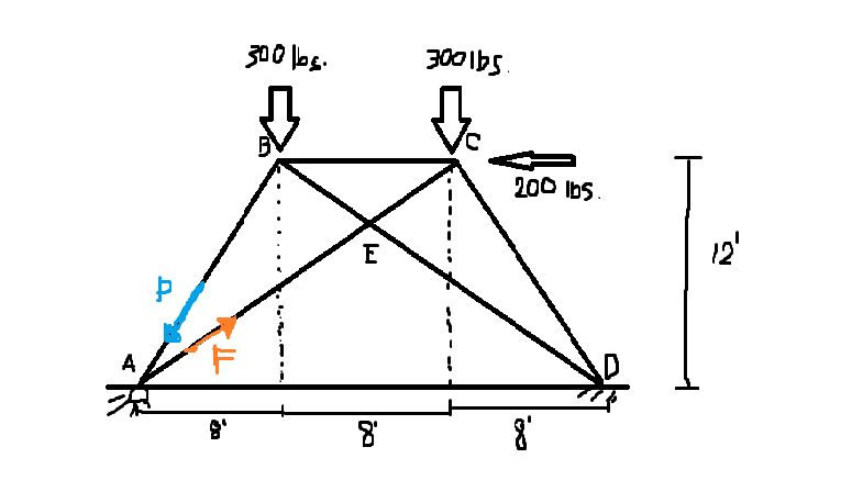 the loads applied to the truss shown in the figure cause reactions shown at A & D. A free body diagram of hinge A forms concurrent force system shown enclosed at A. Determine the magnitude of forces P & F directed respectively along bars AB & AE that maintain equilibrium of this system.