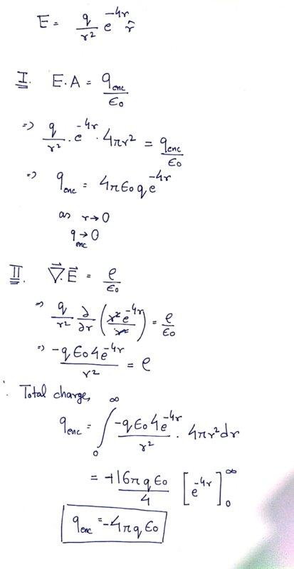 - Calculate the total charge of an unknown charge distribution for which the electric field is E=q/r^2 e^(-4r) r ̂