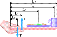 The mass of the tray itself is 0.218 kg, and its center of gravity is located at its geometrical center. On the tray is a 1.28-kg plate of food and a 0.255-kg cup of coffee. Assume L1 = 0.0590 m, L2 = 0.109 m, L3 = 0.242 m, L4 = 0.373 m and L5 = 0.398 m. Obtain the force T exerted by the thumb (enter first) and the force F exerted by the four fingers. Both forces act perpendicular to the tray, which is being held parallel to the ground.