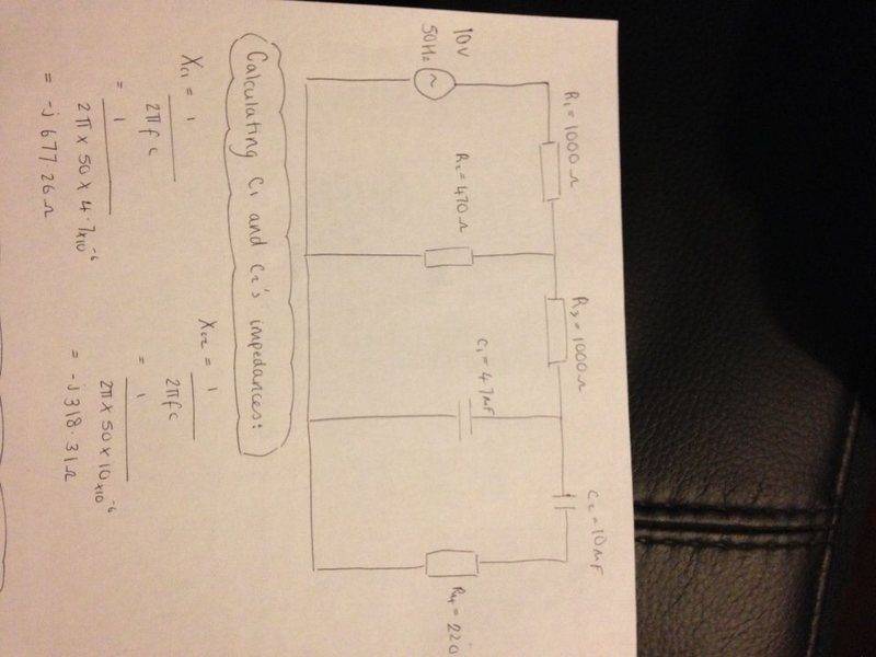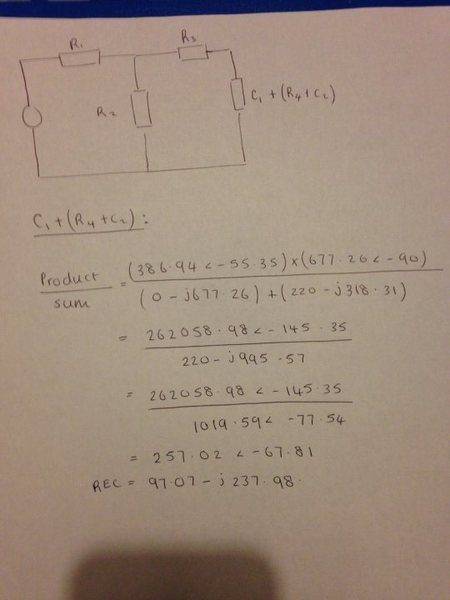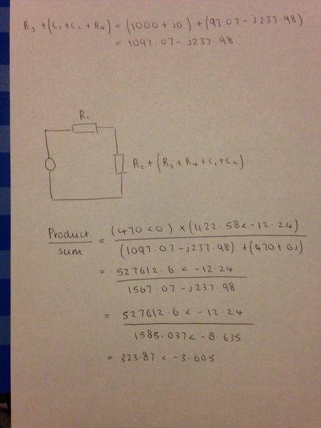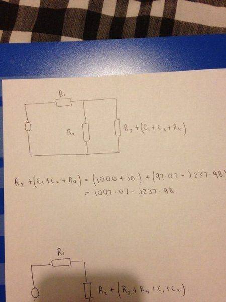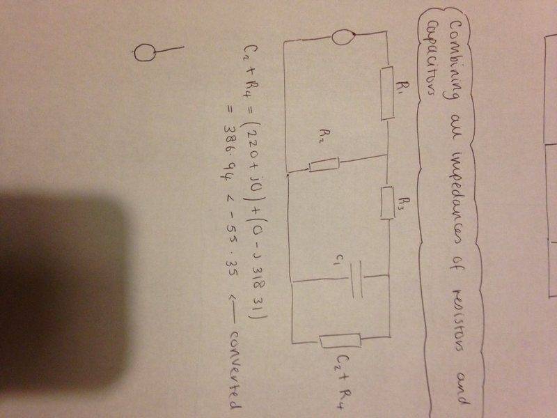 As shown in the pictures, I have calculated the combined impedance of all the resistors and capacitors in the circuit.