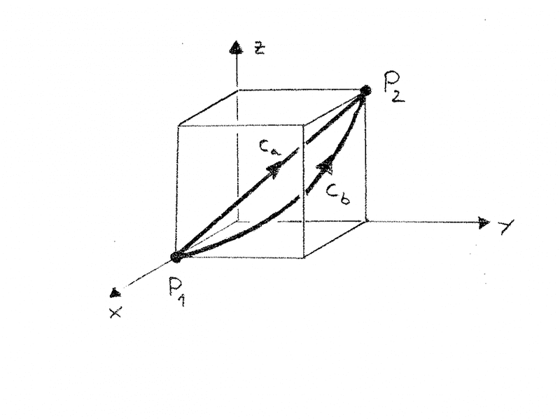 Calculate the work with the line integral ##\int_{C} \vec{F} \cdot d\vec{r}## from point ##P_1(1,0,0)## to ##P_2(0,1,1)## along: