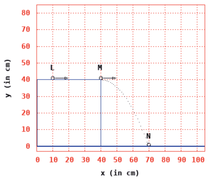 - A very small steel marble is shown rolling at a constant speed on a horizontal table. The marble leaves the table at M, falls, and hits the ground at N. This is illustrated in the diagram below which is drawn to scale. Calculate the time it took the marble to travel from L to N.