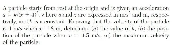 I even got stuck when I thought about it briefly. When the particle's velocity reaches maximum , the acceleration must be 0 , and either k=0 or x must be at infinity . After that , I have no idea what i can do about it . Shall I use definite integration (from 0 to infinity) or indefinite integration (which leaves the integration constant C )? what I am sure is merely that k has to be obtained by integration and the given numerical data.